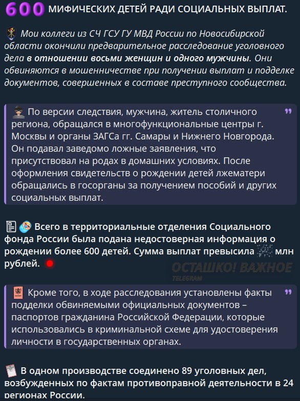 «Мои коллеги из СЧ ГСУ ГУ МВД России по Новосибирской области окончили предварительное расследование уголовного дела в отношении 8 женщин и 1 мужчины. Они обвиняются в мошенничестве при получении выплат и подделке документов, совершенных в составе преступного сообщества».