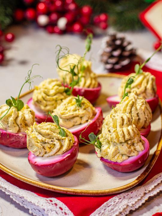 5. Финальное оформление. Наполните половинки яиц получившейся начинкой с помощью кондитерского мешка или ложки. Подавайте на красивом блюде, украсив зеленью. Эти яркие свекольные яйца станут настоящим кулинарным трендом на вашем праздничном столе.