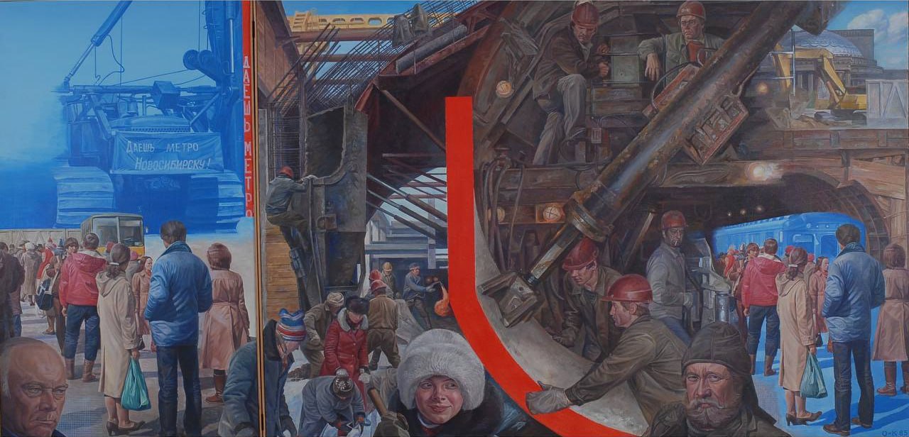 Покажут и тематические произведения живописи и графики, в том числе из фондов НГХМ. Это, например, диптих Михаила Омбыш-Кузнецова «Метро для Новосибирска» — индустриальный пейзаж, созданный в 1985 году, когда город был в предвкушении запуска подземки. Ярким акцентом выставки станет и макет рельефа для станции «Красный проспект» — работа Владимира Грачёва «Победный марш» (1985).