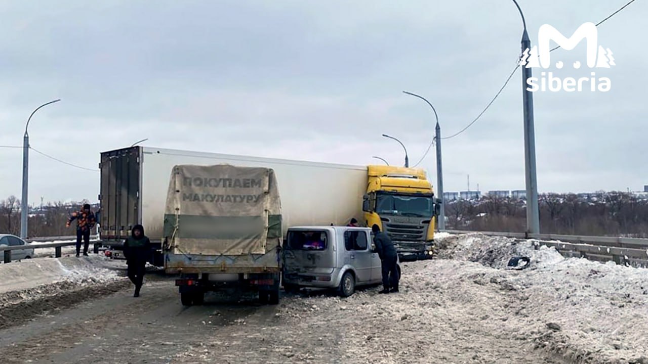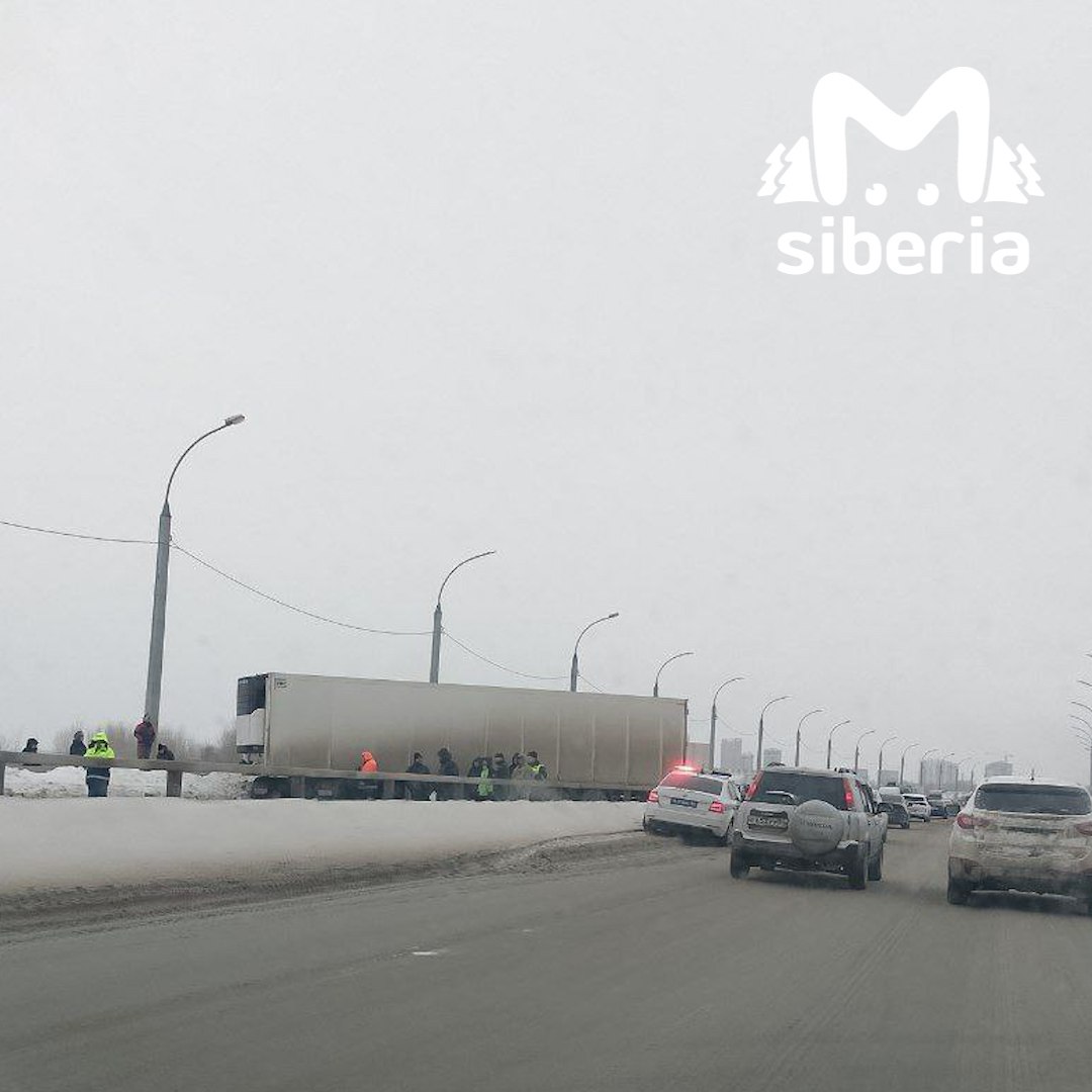 Фура перекрыла Бугринский мост в Новосибирске после тройного ДТП.