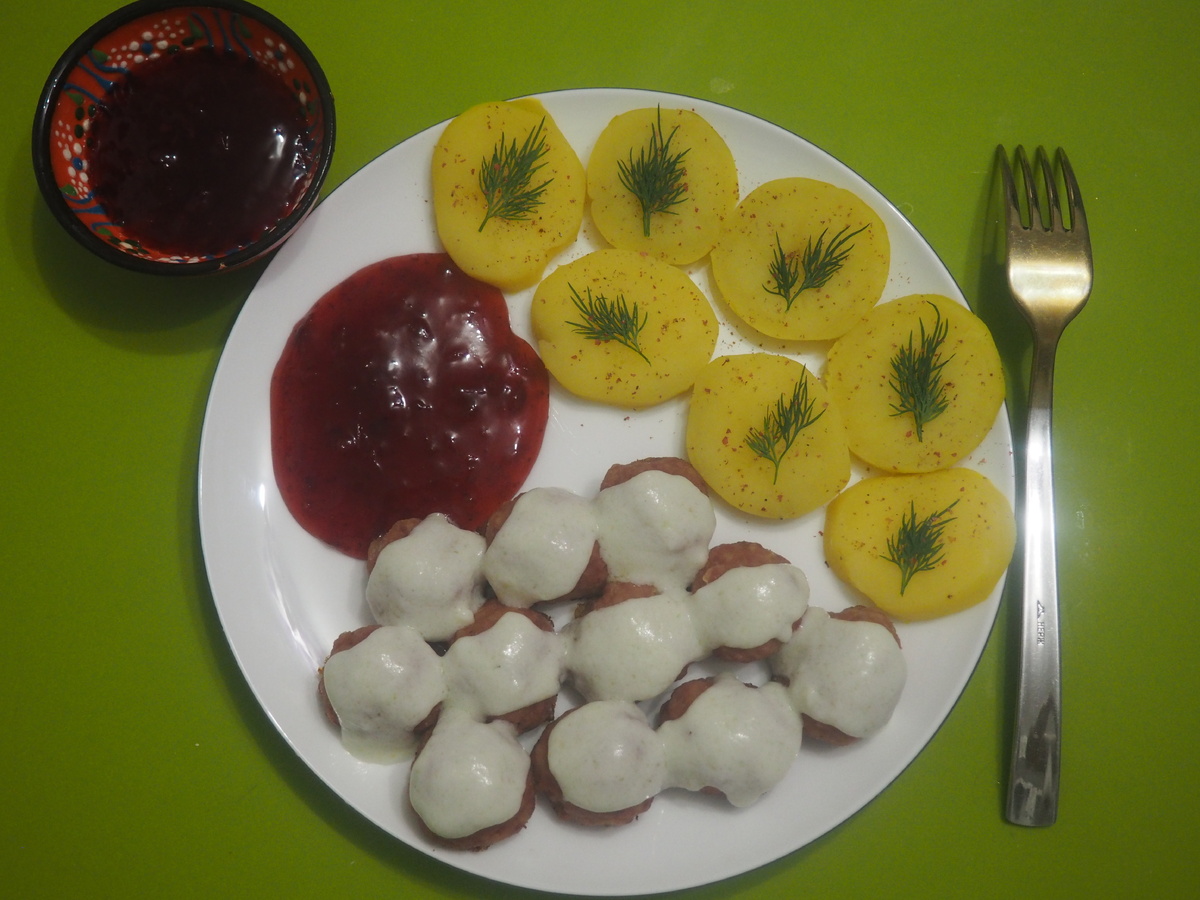 Фрикадельки формируются в небольшие шарики — не более 5 см в диаметре. Обваляйте их в муке и выложите на противень, застеленный бумагой для выпечки. Выпекайте в предварительно разогретой до 190°C духовке примерно 40 минут. По окончании приготовления фрикадельки полейте сливочным соусом и подавайте с любимым картофельным гарниром, щедро сбрызнув брусничным соусом для истинного шведского удовольствия.