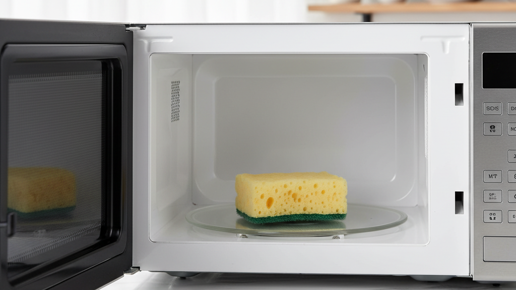 Губка в микроволновке. Устали от загрязнений в микроволновой печи? Просто намочите губку и подогрейте в микроволновке — пар размягчит грязь, и вам останется только протереть.