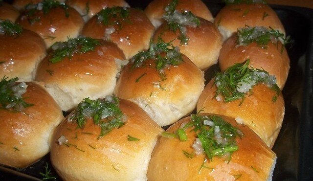 Когда тесто увеличится вдвое, руки смазываются растительным маслом, и из теста формируются небольшие шарики. Пампушки выкладываются на смазанный маслом противень, где должны немного подняться, прежде чем отправиться в разогретую до 180°C духовку, выпекаясь до золотистого цвета.