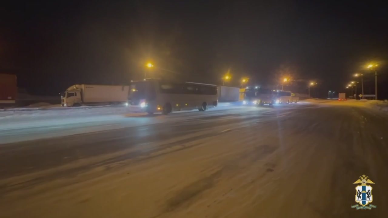 Учитывая, что непогода не стихала, руководство полиции приняло решение сопроводить 4 автобуса до Новосибирска.
