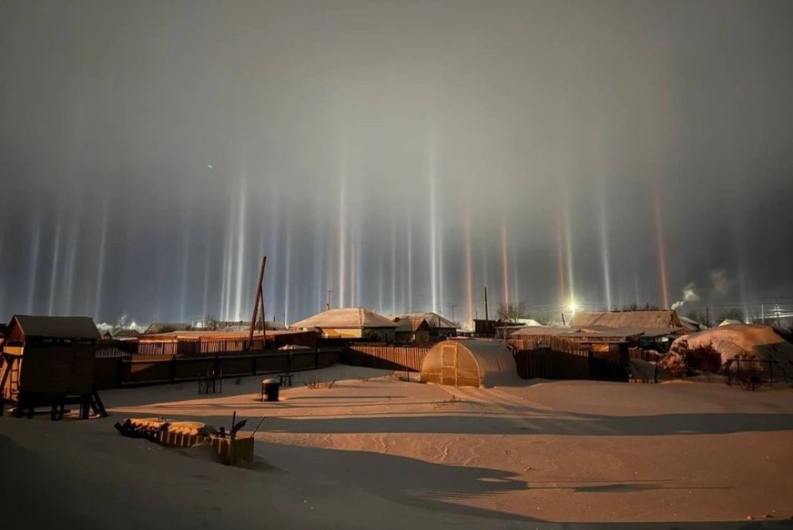 Такую красоту удалось запечатлеть жителям поселка Чистоозерное. Световые столбы образуются при низкой температуре и небольшом количестве влаги в воздухе. Свет от Солнца, Луны или уличных фонарей преломляется в них и создает эффект вертикальных светящихся полос.