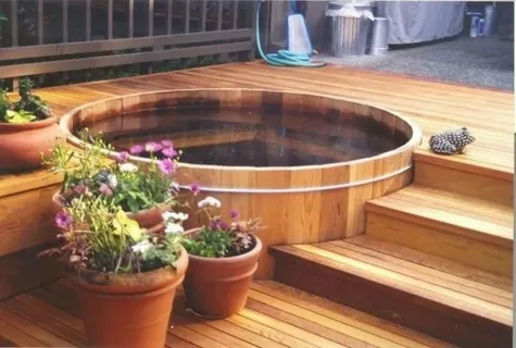 Для тех, у кого есть старая чугунная или стальная ванна, эта идея будет особенно актуальной. Ванна сама по себе может стать основной купели, хотя, чтобы она вписалась в ландшафт, стоит рассмотреть варианты её установления. Можно вкопать ванну в землю, создав временный дренаж, либо соорудить вокруг неё деревянный кожух. Более простой вариант — построить каркас из бруса или поддонов, чтобы скрыть неприглядные стенки ванны, что позволит эстетично вписать купель в общий дизайн участка.