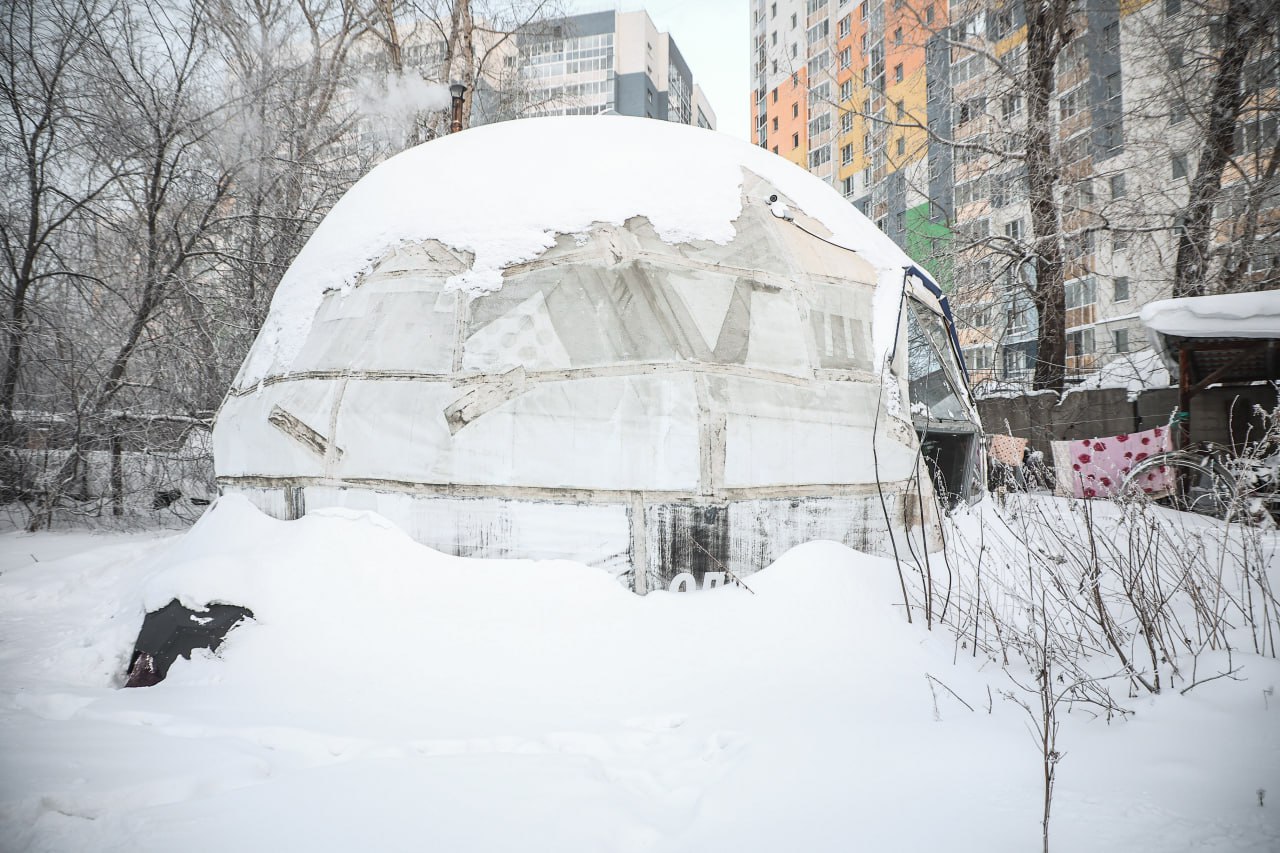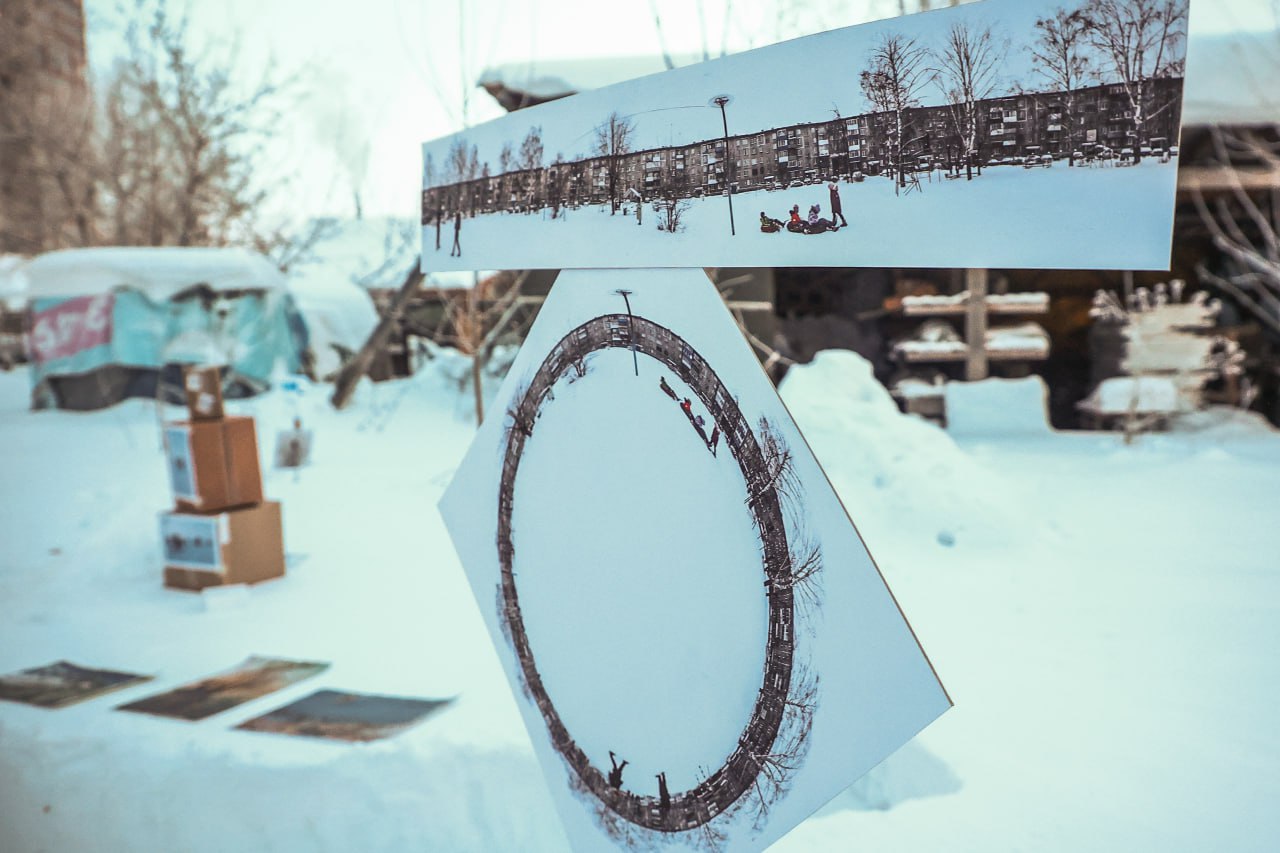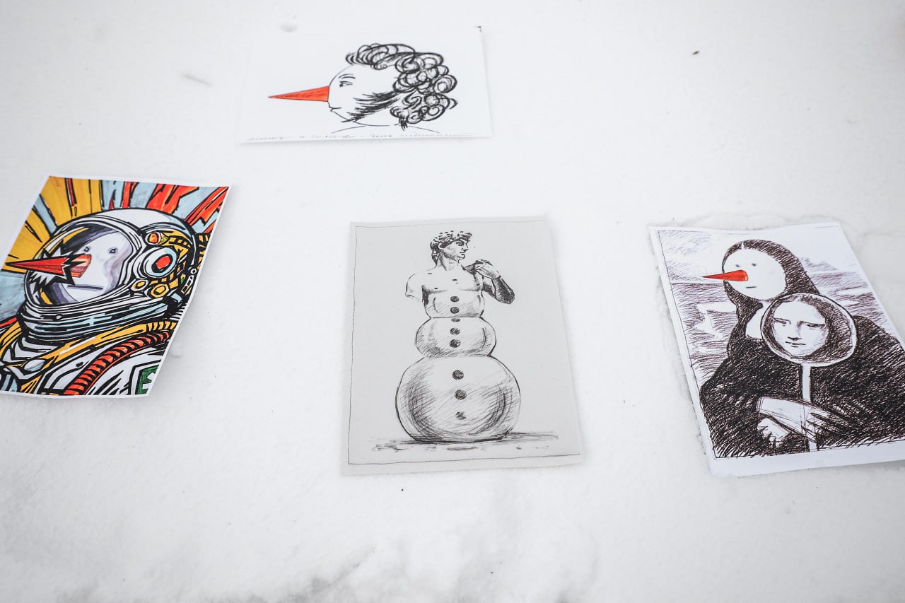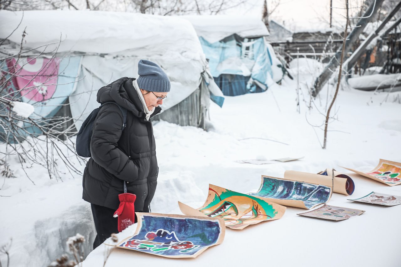 В последний день самой морозной недели января в Новосибирске прошла спонтанная выставка под названием «Холодно-26». Экспозицию из живописных и графических работ, а также фотографий и инсталляций разместили прямо на снегу во дворе купольного дома в микрорайоне «Лесоперевалка».