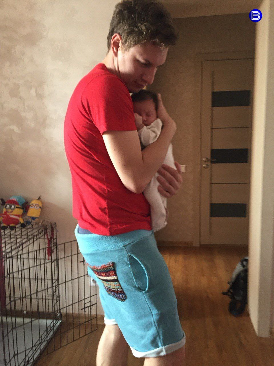 На первом фото юморист крепко прижимает новорождённую малышку к груди. На второй — уже взрослая девочка обнимает папу и прижимает его голову к себе.