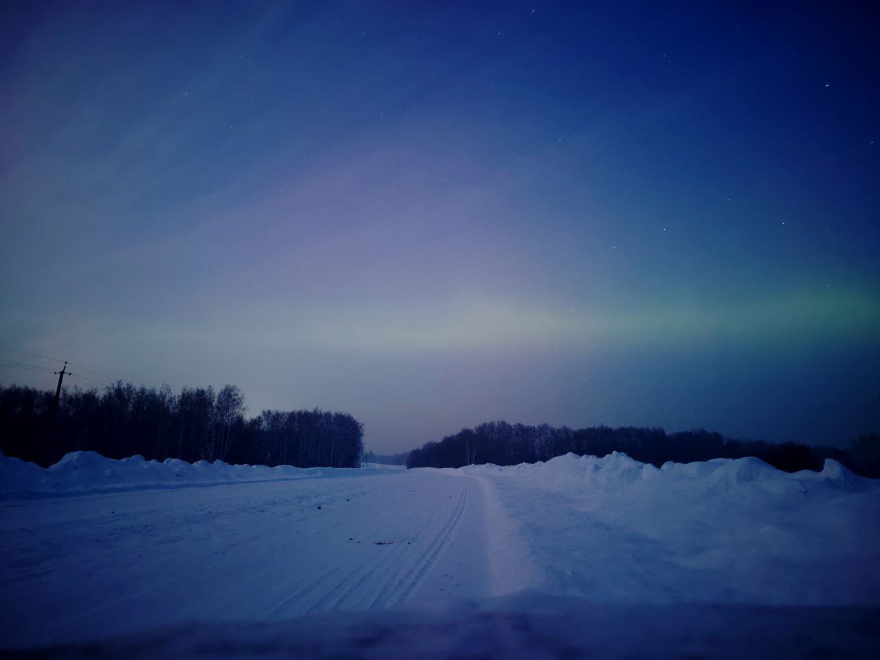 Алексей Поляков сделал кадры на смартфон прямо с капота машины. При ясной погоде дугу сияния можно увидеть невооруженным глазом.