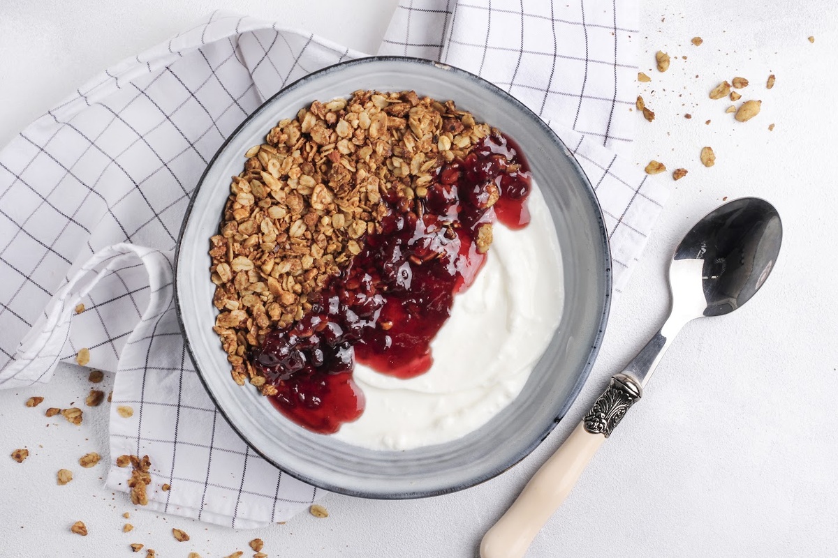 Шаг 2: В глубокой тарелке идеально разместите йогурт и гранолу. Полейте теплым ягодным соусом и подавайте сразу же.