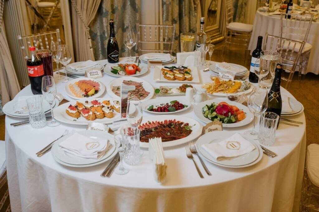 Не менее впечатляющие закуски — например, эклеры с тремя видами рыбных тартаров с творожным кремом и камамбер „чёрный бархат“ с лаймовым вареньем. Эти блюда подчеркнут изысканность любого мероприятия.