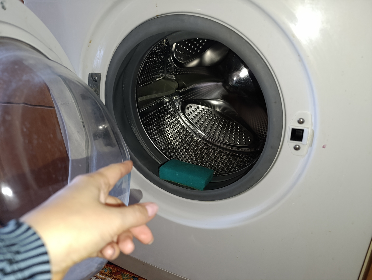 Важно выбрать правильную часть губки и ограничиться основным этапом стирки. Жёсткий абразив следует убрать, чтобы защитить волокна ткани. Затем помещают только мягкую пористую сторону губки в барабан — она не царапает ткань и эффективна в сборе мелких частиц.