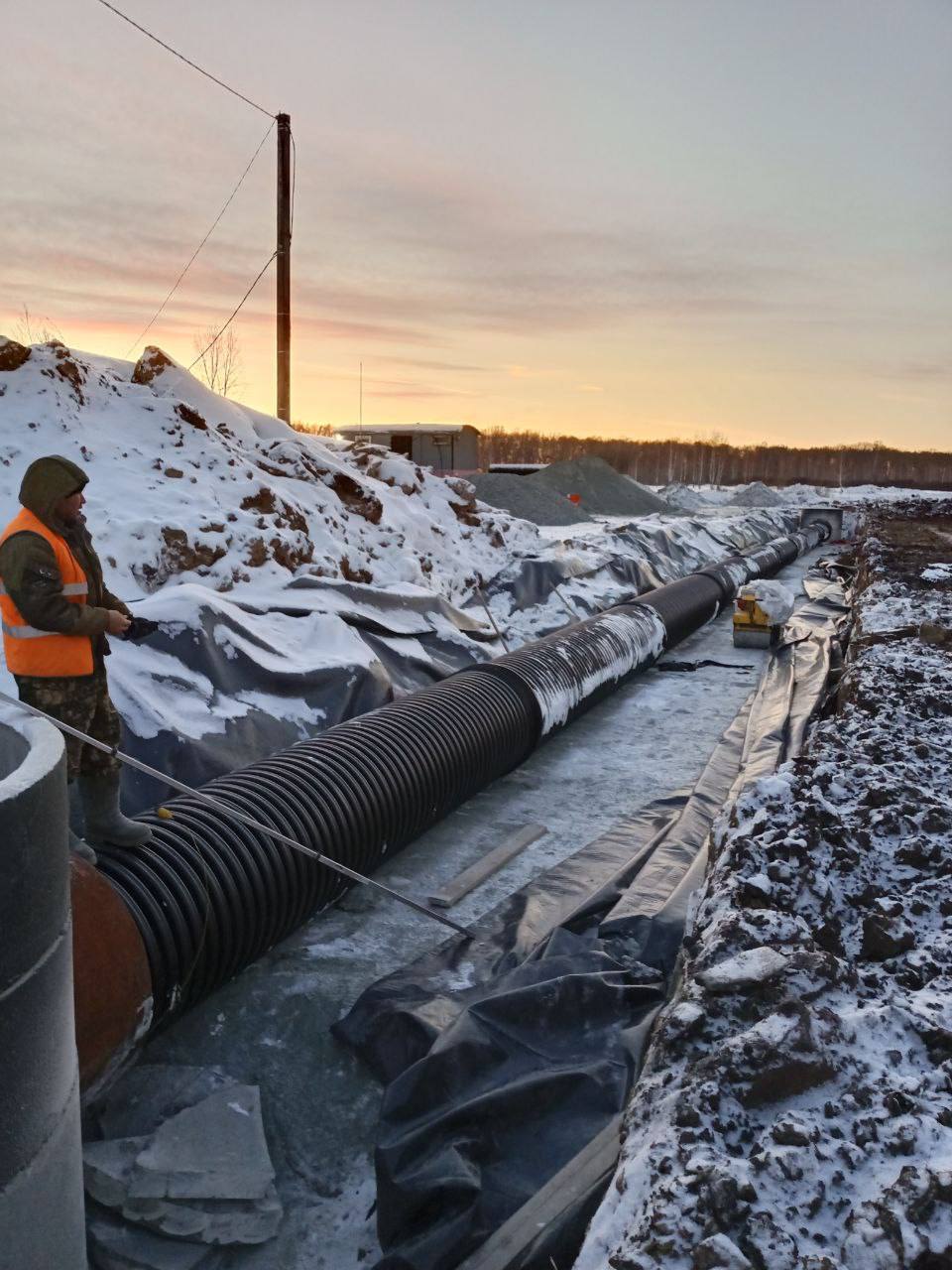 Сейчас подрядчик прокладывает ливневую канализацию — роют траншеи, укладывают трубы и монтируют колодцы. Параллельно укрепляют основание будущей дороги: заменяют переувлажнённый грунт, формируют прочную подушку, чтобы покрытие было устойчивым и не деформировалось со временем.