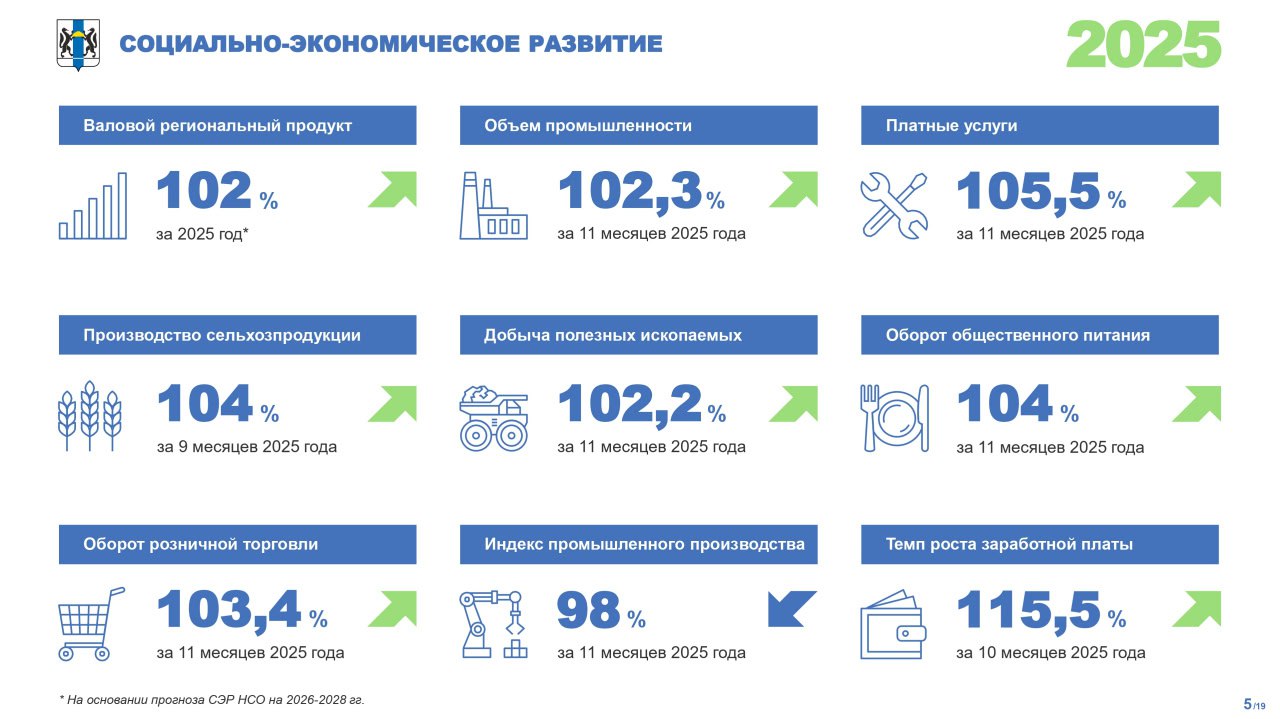 Кроме того, Андрей Травников подчеркнул, что индекс промышленного производства в регионе ненамного, но все же превысил средний по Сибирскому федеральному округу. Индекс производства продукции сельского хозяйства в прошлом году составил 104% к 2024 году. «Несмотря на сложнейшие погодные условия, наши аграрии собрали 3,3 млн тонн зерна», – добавил глава региона. В прошлом году выросли обороты розничной торговли и сферы общественного питания, объёмы оказанных платных услуг.