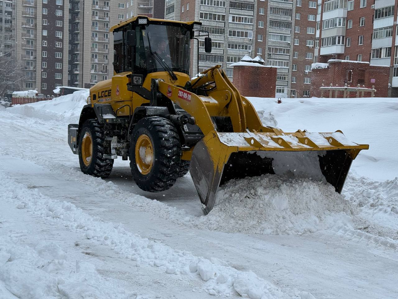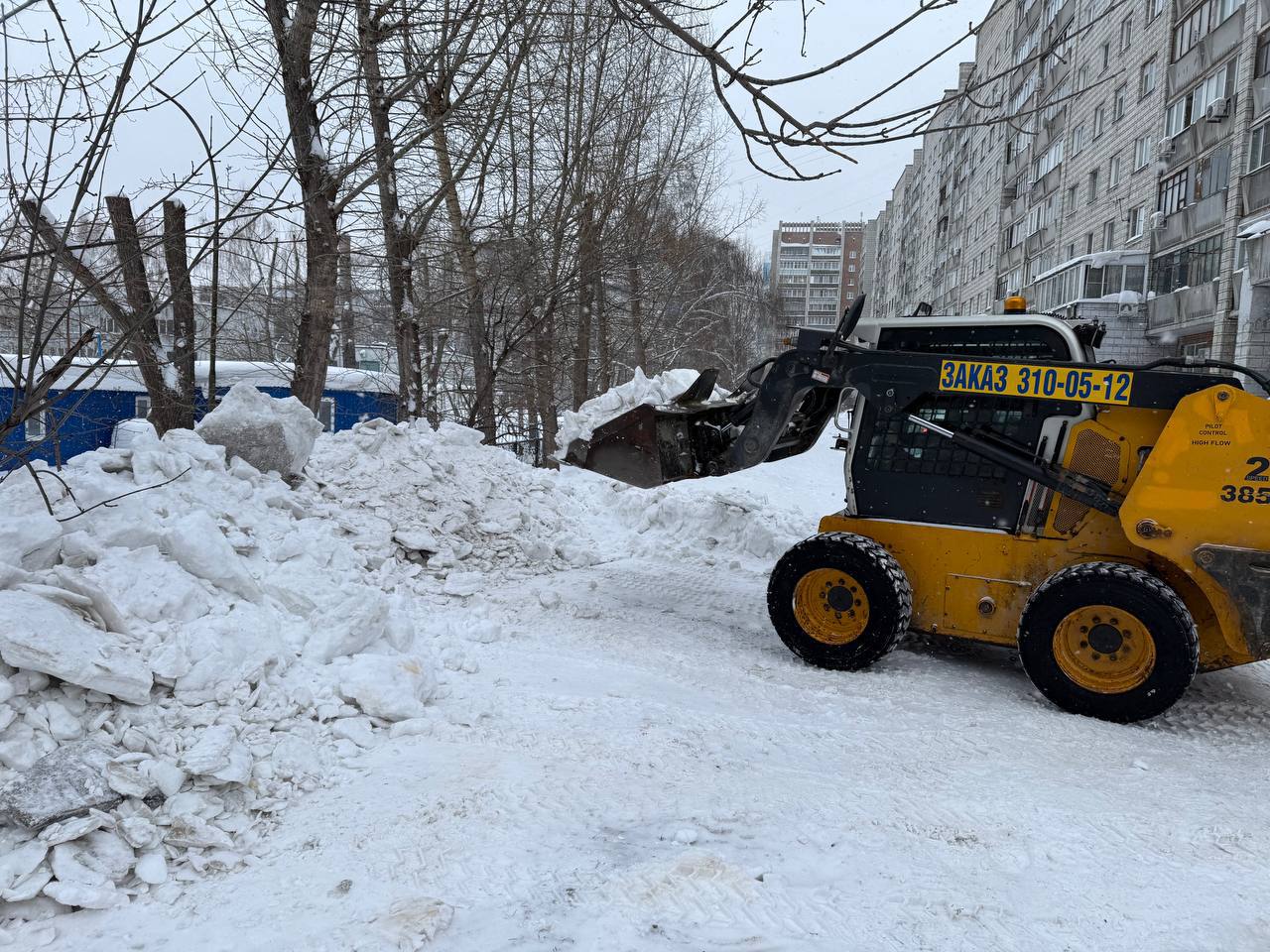 Сегодня снег в Дзержинском районе убирают также на ул. Кошурникова возле домов № 6, 16 и во дворе дома на ул. Алейской, 14.