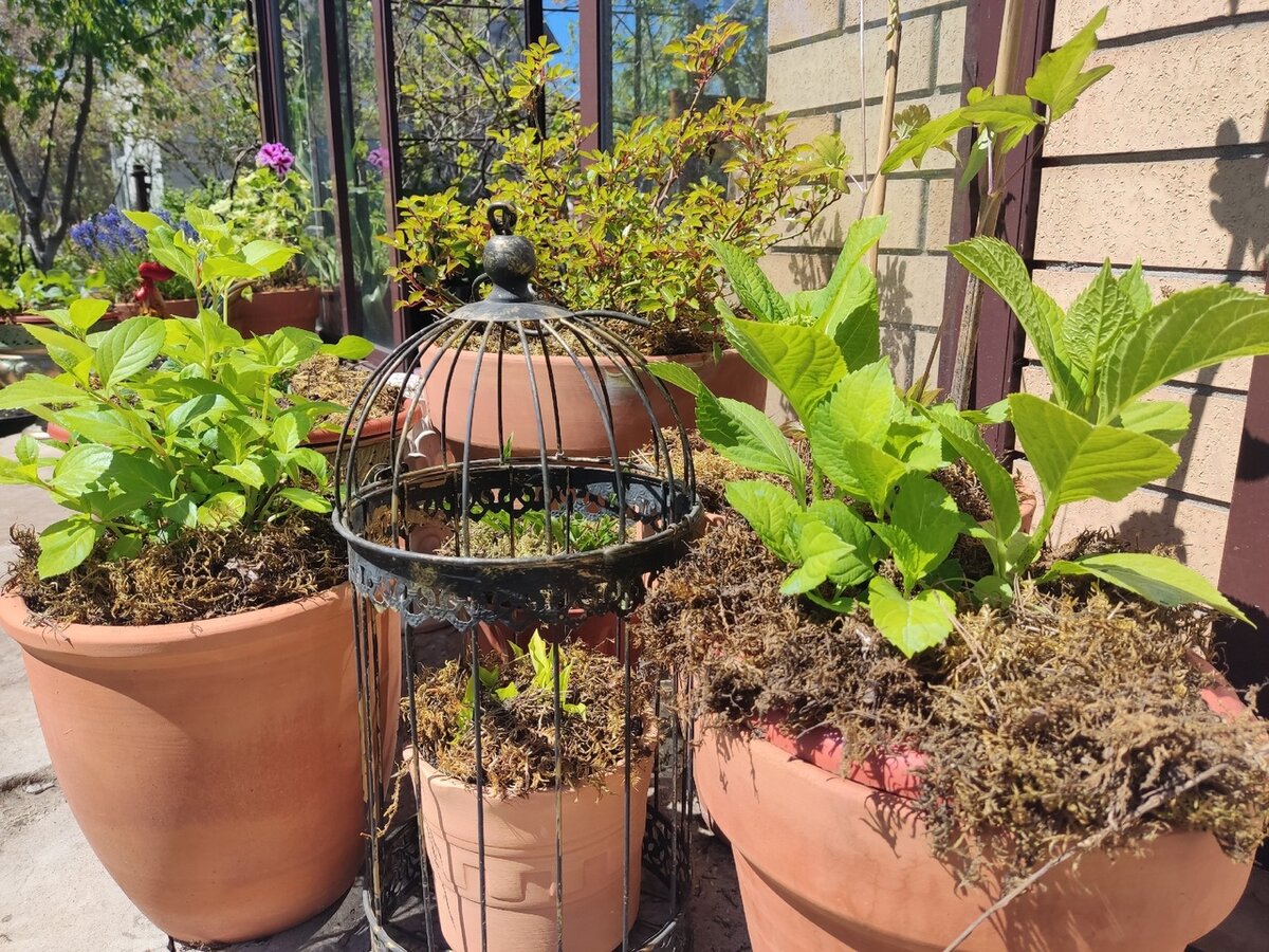 Гортензии решили не оставлять без внимания, так как они очень чувствительны к зимним условиям. В этом году акцент был сделан на ремонтантные сорта, с надеждой на яркие цветения. Особенно запоминается гортензия "Сбежавшая невеста", которая неплохо адаптировалась к условиям улицы, хотя один из ее горшков подвергся нападению мыши и оказался поврежденным.
