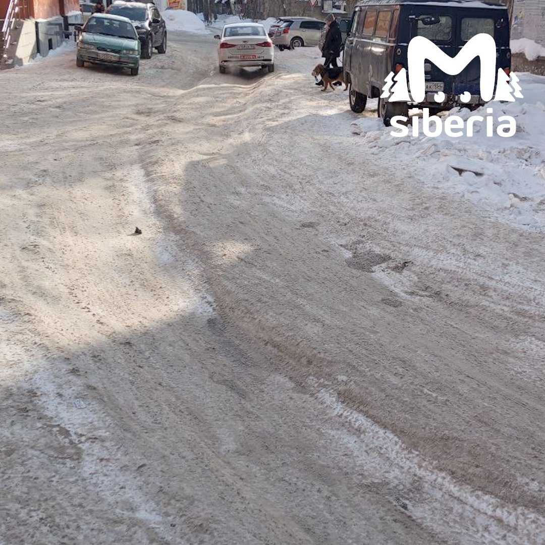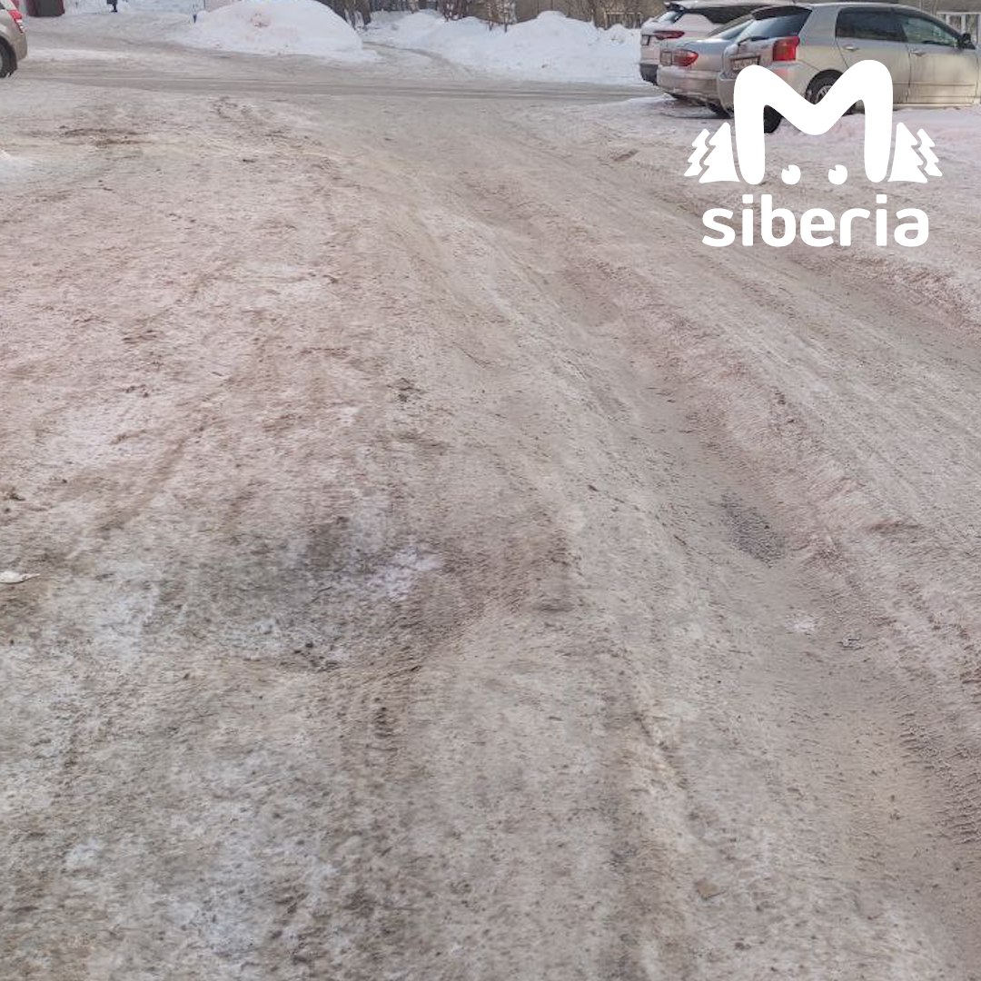 Въезд во двор ни разу за зиму не чистили на Варшавской в Новосибирске. На дороге уже 20-сантиметровая колея.