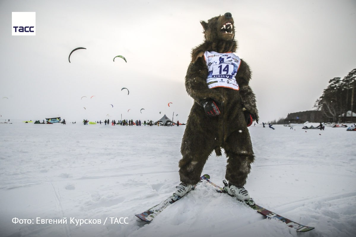 На фото — участник Кубка Сибири по зимнему кайтингу в костюме медведя.