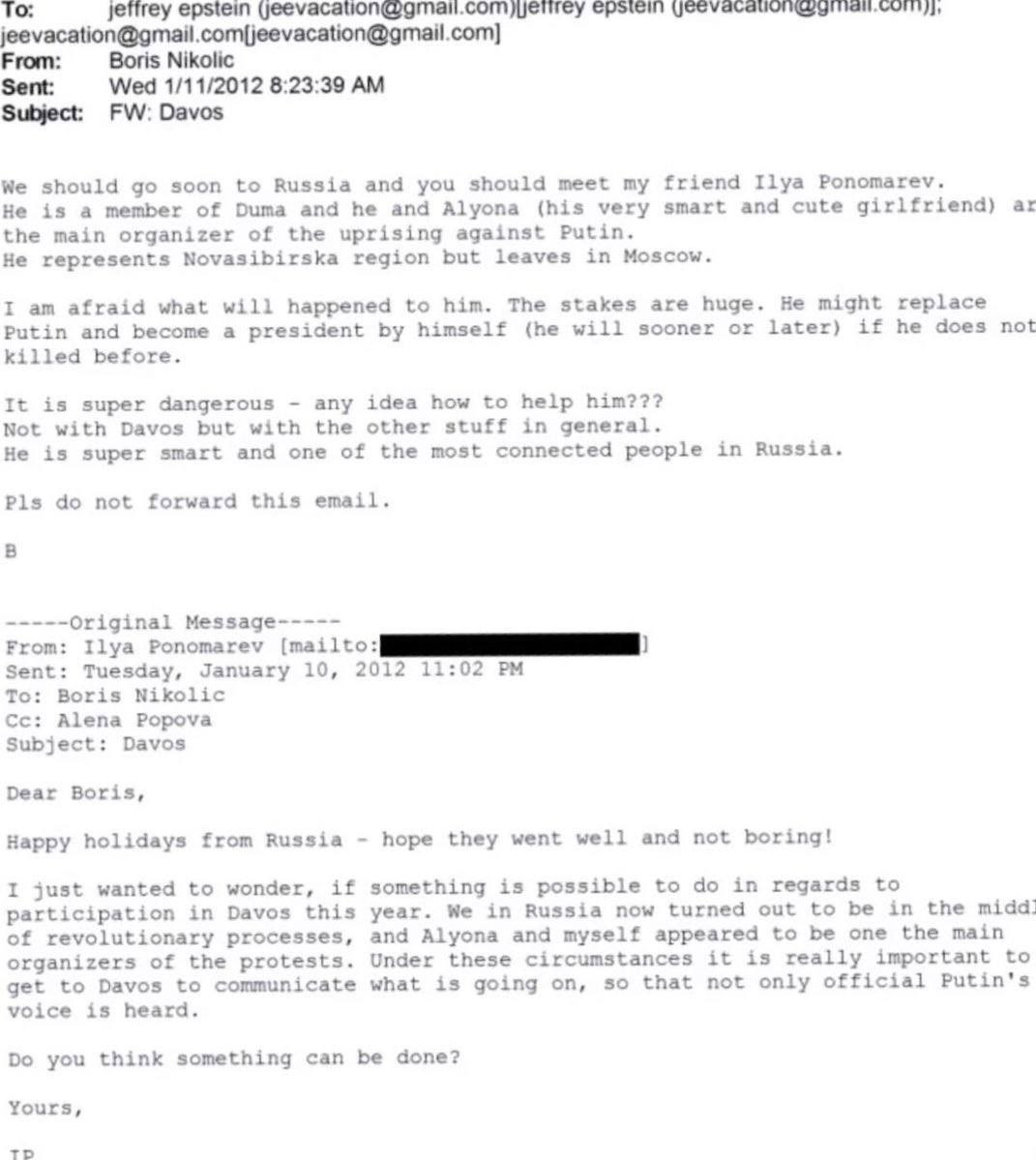 Я просто хотел узнать, можно ли что-нибудь сделать в отношении участия в Давосе в этом году. В России мы оказались в эпицентре революционных процессов, и мы с Алёной, похоже, стали одними из главных организаторов протестов. В этих обстоятельствах действительно важно попасть в Давос, чтобы рассказать о происходящем, чтобы был слышен не только голос официального Путина.
