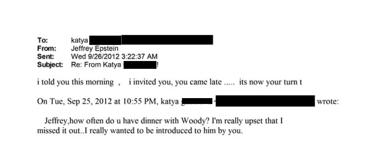 в 2012 году специально для россиянки он организовал встречу с Вуди Алленом, но девушка не пришла, за что потом ей пришлось извиняться перед Эпштейном;