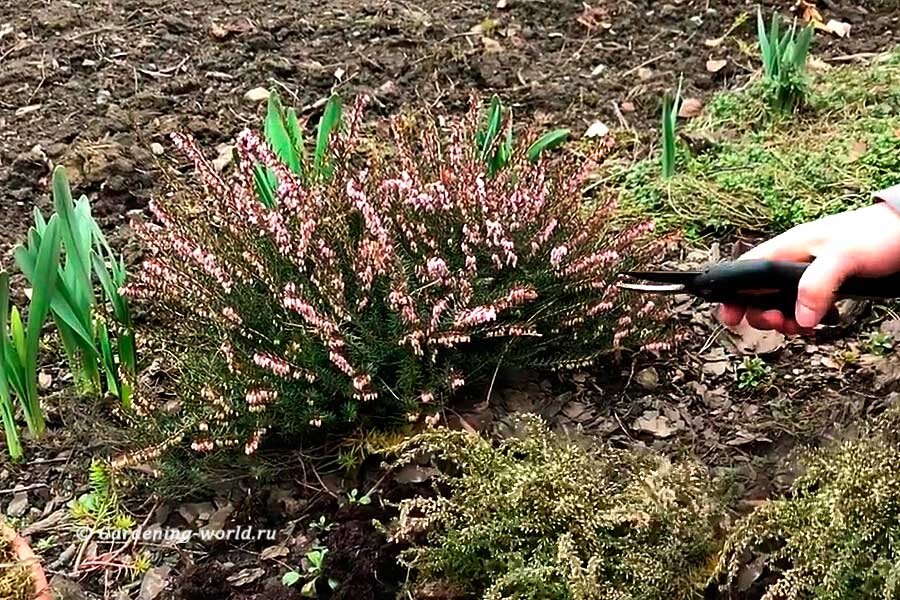 - Весеннецветущие сорта, такие как красный вереск, обрезают после цветения, чтобы к осени у них развились новые побеги и цветочные почки на следующий год.