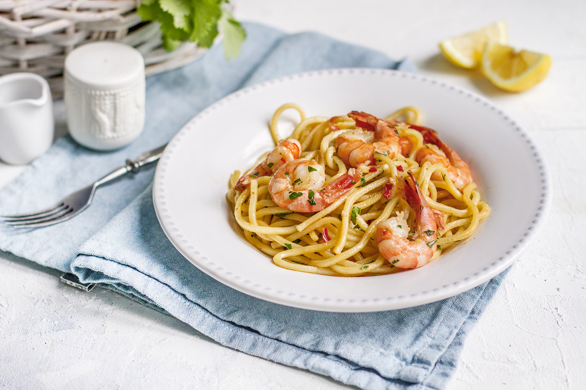 Изысканный вкус спагетти «Альо-Ольо» с креветками и сладким чили