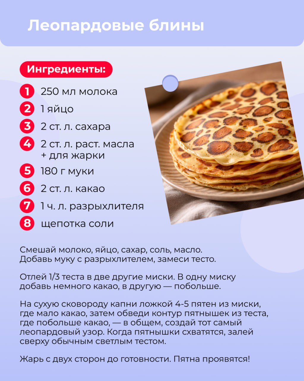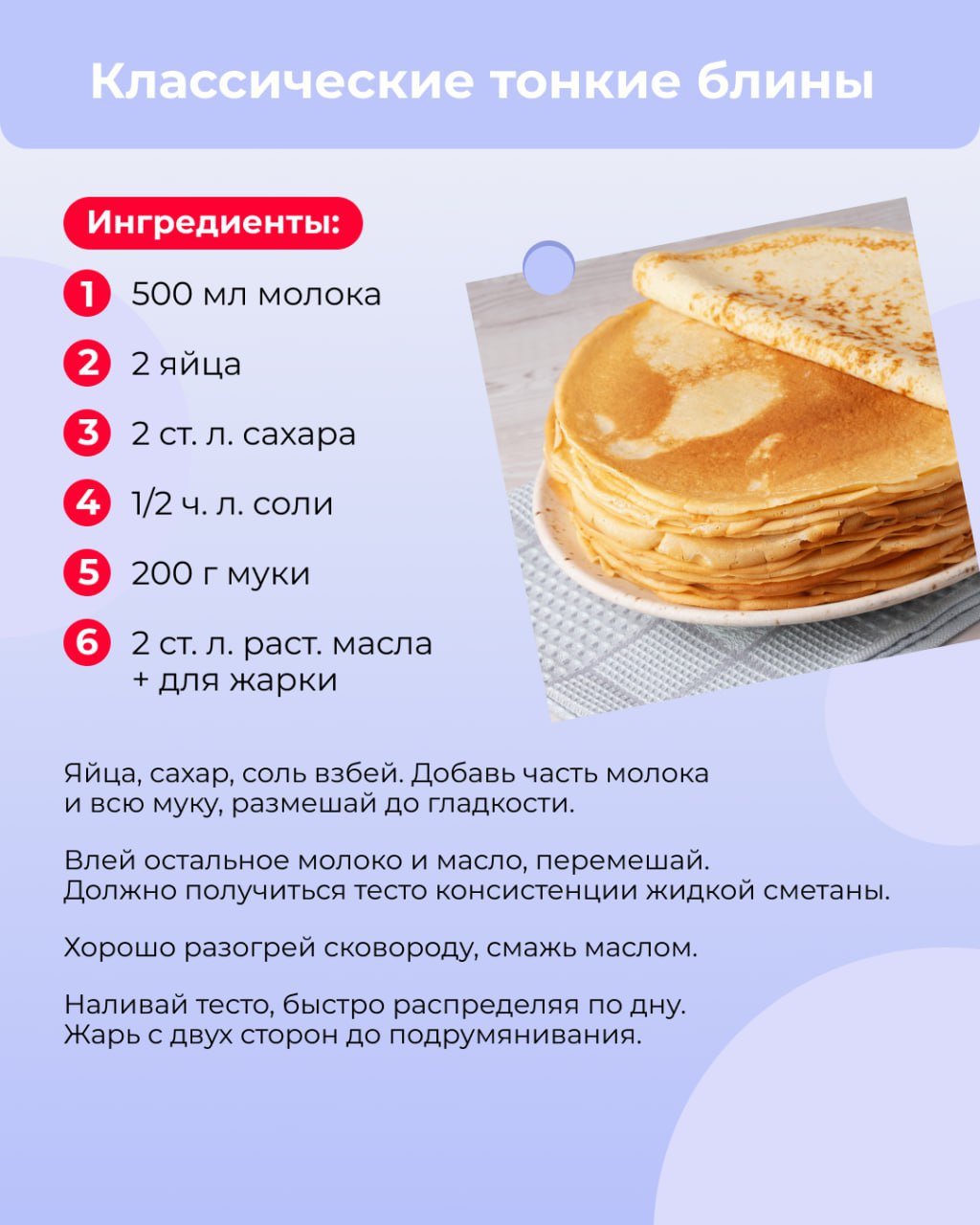 А чтобы вдохновить на кулинарные подвиги — делимся тремя крутыми рецептами блинов в карточках. Тем, кто к середине масленичной недели уже устал от классики, советуем присмотреться к первым двум вариантам.