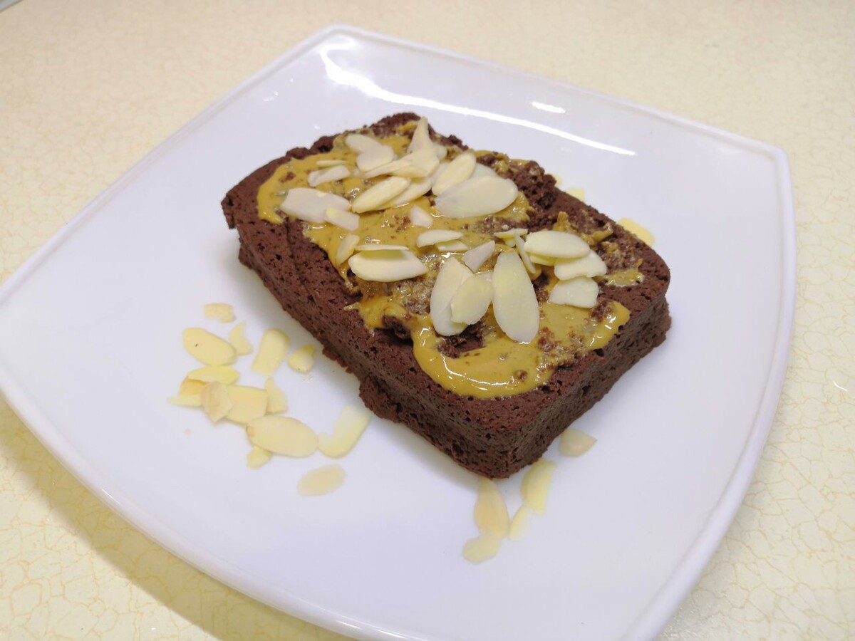 По окончании времени, если кекс будет немного разваливаться при извлечении, не паникуйте — просто аккуратно соберите его воедино. Кекс будет мягким и податливым к формованию. Для изысканного вкуса можно украсить его арахисовой пастой и миндальными лепестками.