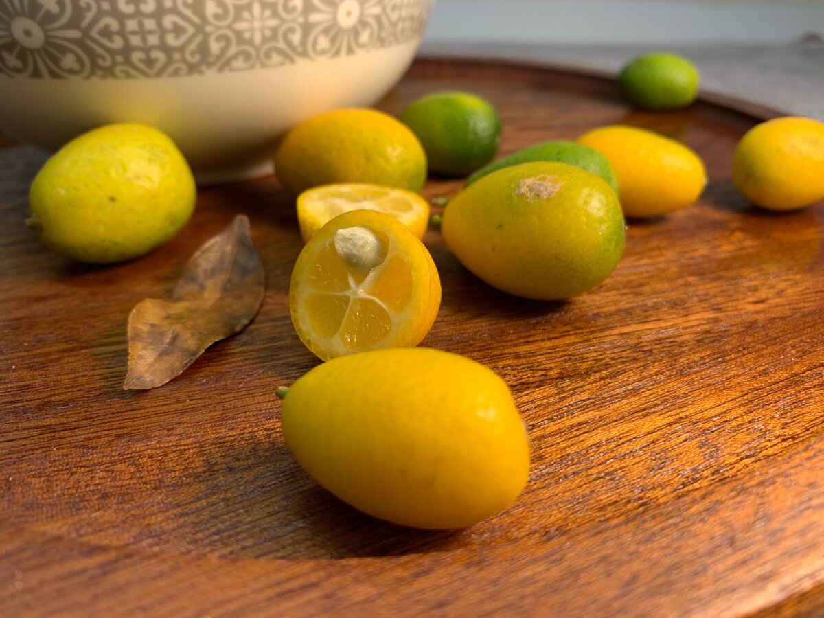 Кинкан – самое маленькое представление цитрусовых с ярким оранжевым окрасом, которое иногда может быть даже зеленоватым. Размером всего 2-4 см, этот фрукт выделяется вытянутой яйцевидной формой и напоминает миниатюрную копию апельсина. Хотя он может быть дороже фейхоа, его уникальный вкус и легко очищаемая кожура заставляют попробовать его хотя бы раз.