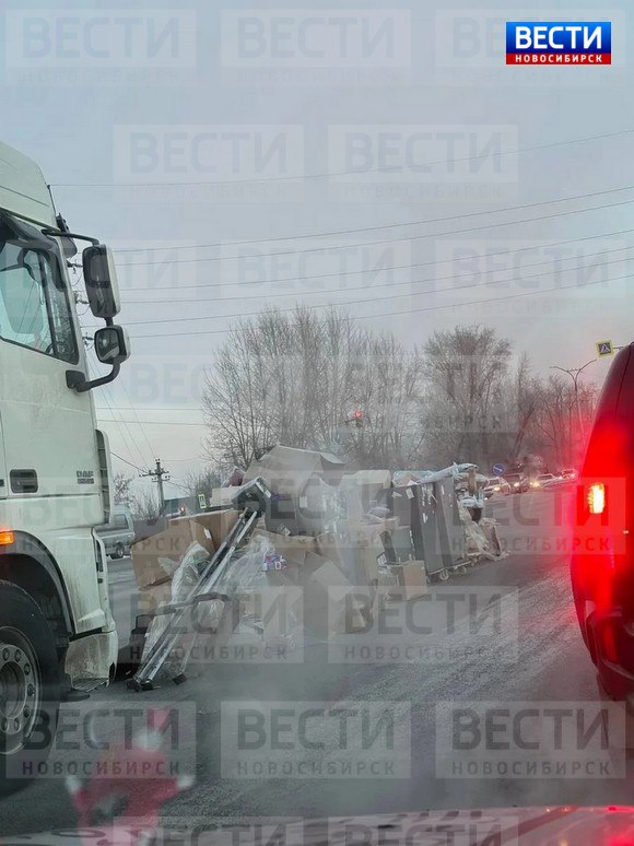 В Первомайском районе Новосибирска вблизи станции Матвеевка посреди дороги внезапно появились коробки, пакеты и даже баки – кто-то явно не закрепил груз!