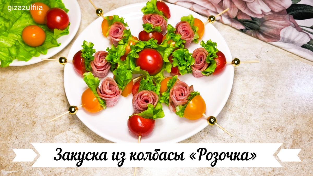 Чтобы создать уникальную «розочку», достаточно взять три кружочка колбасы и уложить их в ряд, немного накрывая друг друга. Затем следует свернуть получившийся ряд пополам и сформировать рулетик. На шампур нанизываем следующие ингредиенты: половинку помидора черри, лист салата, подготовленную колбасную «розочку», снова листик салата и вторую половинку помидора черри в завершение.