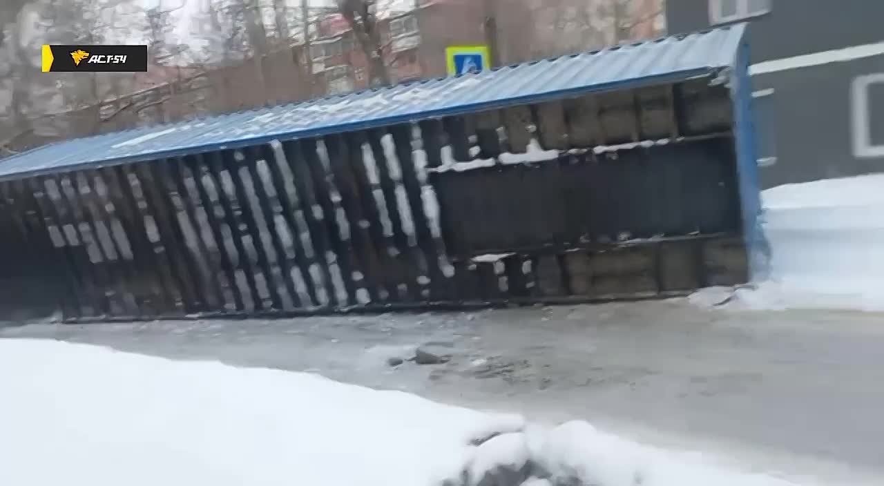 Контейнер слетел с полуприцепа грузовика и опрокинулся на бок