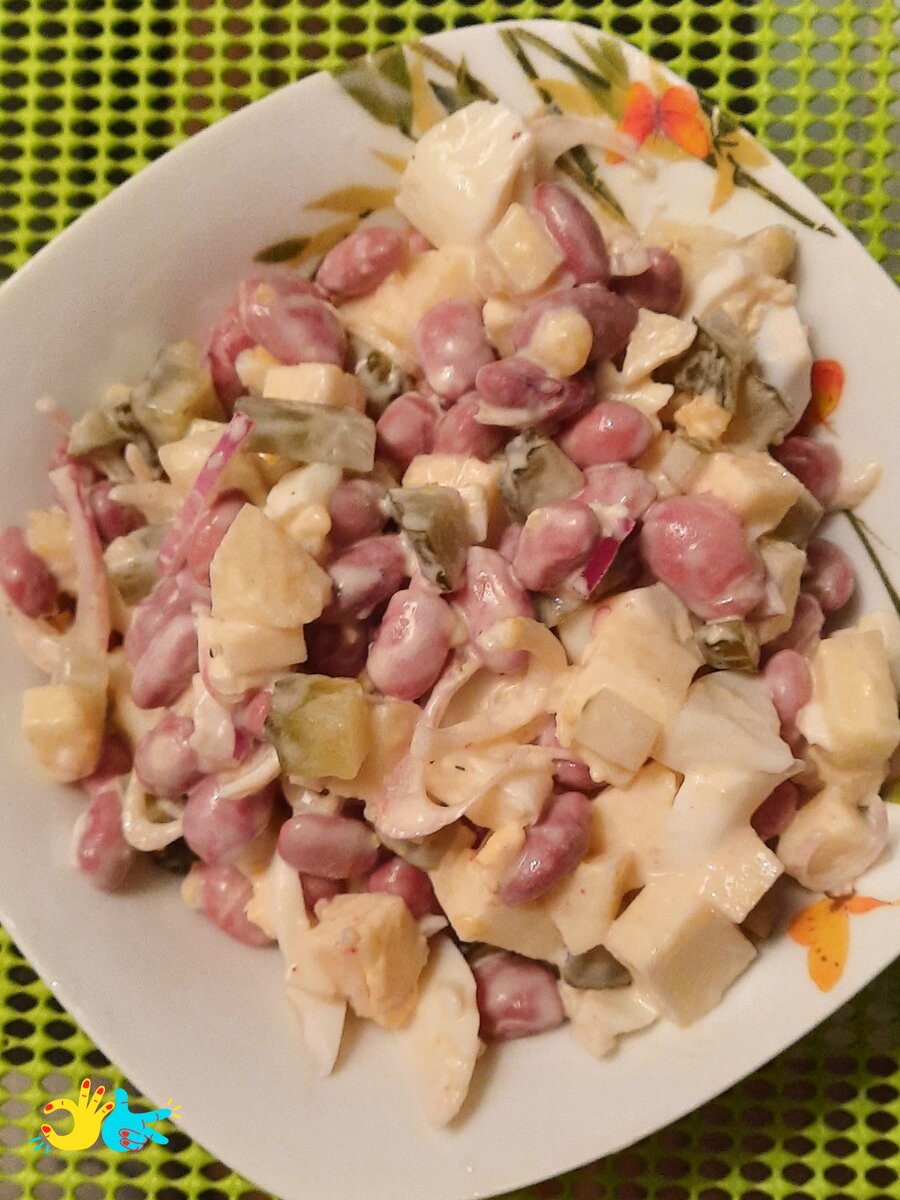 2. Слить рассол из банки с фасолью и выложить её к луку в салатник.
