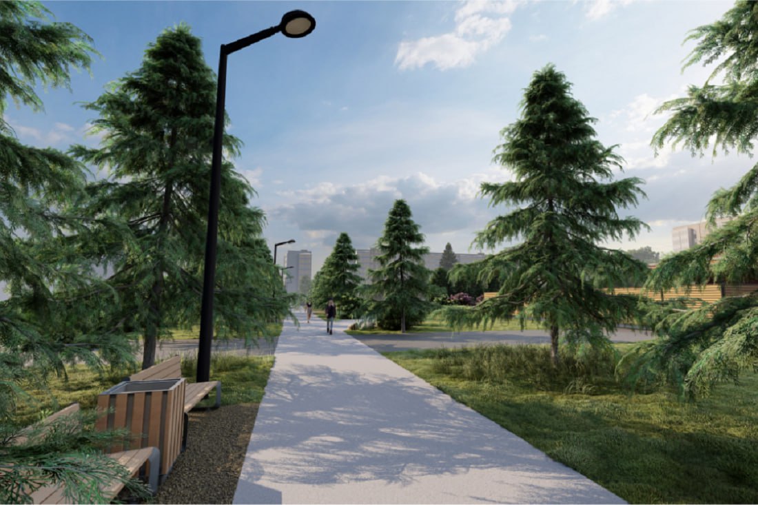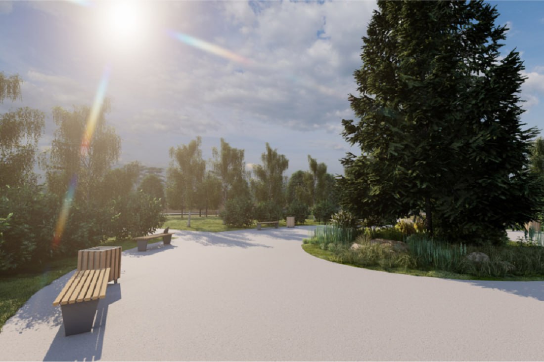 Площадка должна органично вписаться в общую концепцию зелёной зоны — как по архитектуре, так и по ландшафту. Здесь предусмотрели сохранение всех ценных деревьев и кустарников и добавление новых. Участок поделят на функциональные зоны с пешеходными маршрутами, фонарями, системами безопасности и малыми архитектурными формами.