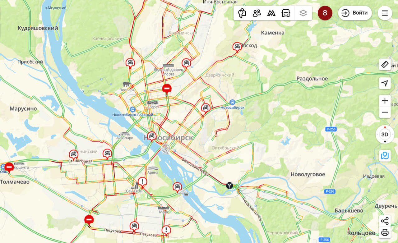 На левом берегу обстановка похожая. Пробки также наблюдаются на многих улицах, в том числе Петухова, Немировича-Данченко, Троллейная, Титова, Станиславского, Широкая, Станционная, Ватутина, а также на Советском шоссе.
