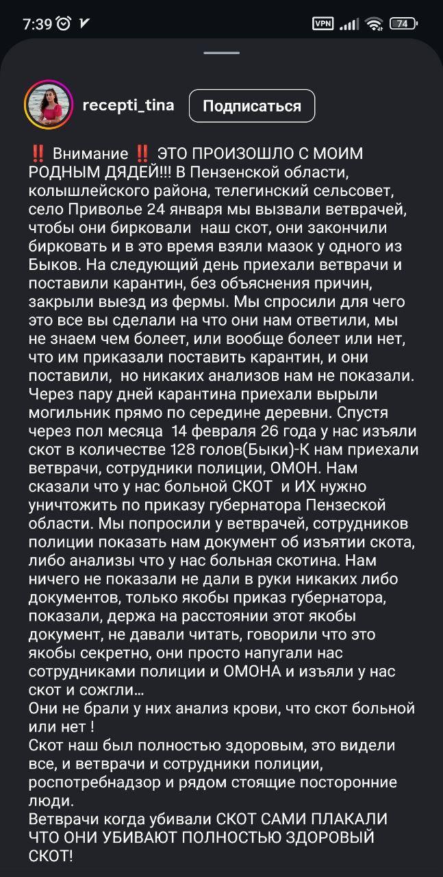 Пензенская область вслед за Новосибирской столкнулась с массовым уничтожением скота, которое больше похоже на зачистку хозяйств, чем на борьбу с эпидемией. В селе Приволье у фермеров изъяли 128 коров под предлогом пастереллеза, при этом ветеринары наотрез отказались показывать документы с подтвержденным диагнозом. Владельцы утверждают, что животные были абсолютно здоровы.
