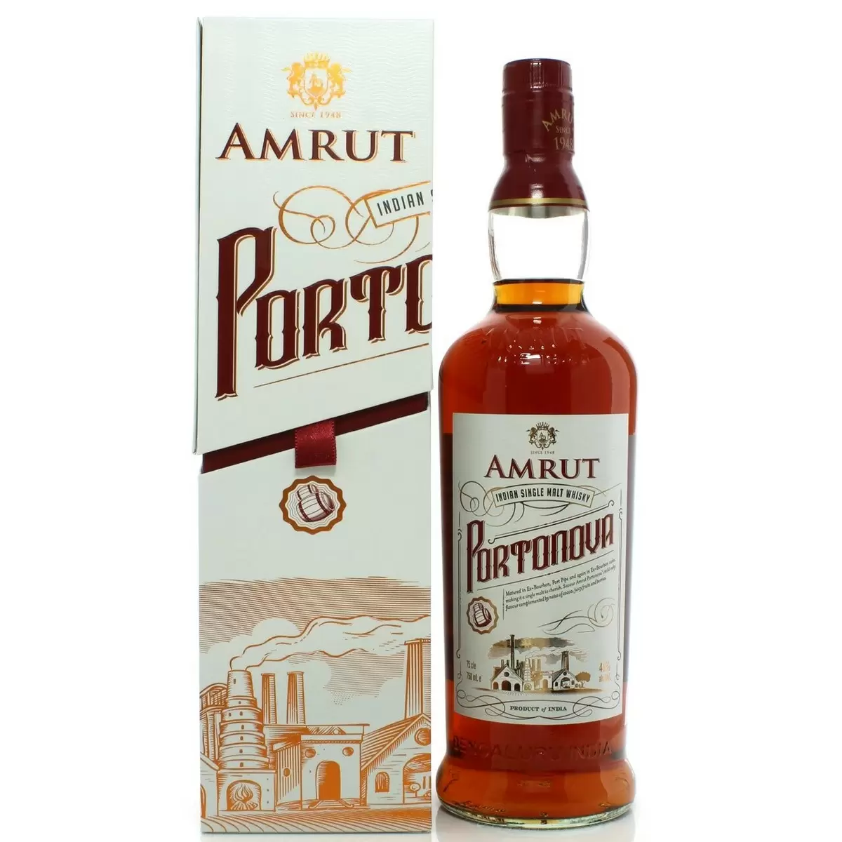 Релиз Amrut Portonova, специально разработанного для магазинов беспошлинной торговли, снижает крепость до 48%. С цветом темно-янтарного оттенка этот виски обладает богатым ароматом тропических фруктов, дуба и специя. На вкус он яркий и мощный, с нотами дуба и легкой фенольностью, что создает сложный и сбалансированный профиль.