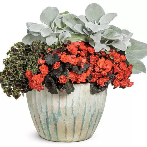 Фактура растений помогает воспринимать пространство как цельный узор: бархатистые листья Колеуса и серебристые листья Сенечио контрастируют с цветами бегонии, добавляя глубину и структуру.