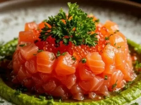 Повар также предлагает яркие закуски, такие как тартар из семги, который готовится за считанные минуты, и брускетту с гриль-овощами. Все блюда легко готовятся, но создают праздничное настроение.