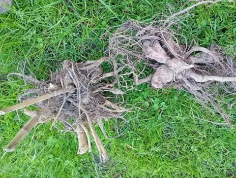 Перед делением необходимо очистить корневище от земли. Если земля плотная, удобно использовать шланг. Работать с чистым корневищем легче, так как хорошо видны участки, которые следует удалить. Острым секатором обрезаются корешки, мелкие клубеньки и поврежденные участки.