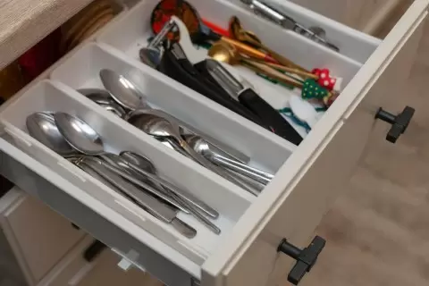 Первый недостаток заключается в его бесполезности. Многие уверены, что благодаря разделению по ячейкам легко поддерживать порядок. Однако в реальности лоток занимает много места и не всегда способен вместить все необходимые аксессуары. Освобождение ящика от этого «органайзера» позволяет ощутимо улучшить функциональность кухонного пространства.