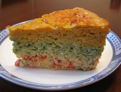 5. Запекание: Форму для запекания смазать сливочным маслом, дно застелить бумагой, стенки обсыпать сухарями. На дно выложить слой с перцем, затем смесь с петрушкой, и завершить слоем с морковью, слегка уплотняя их.