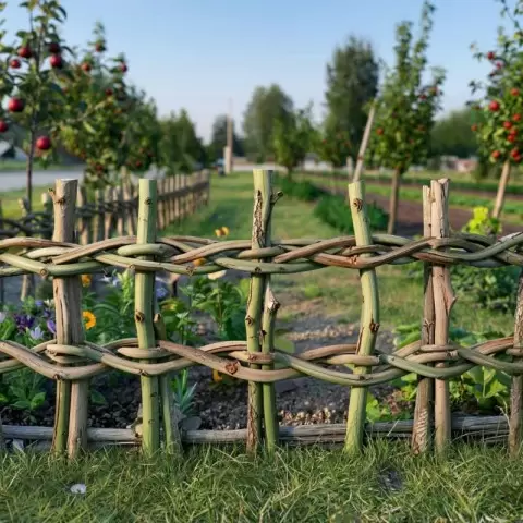 Истинной находкой станет так называемый "живой" плетень, который изготавливается из свежесрезанных ивовых кольев. Они укореняются со временем, превращая забор в зеленую изгородь. Такой вариант обеспечивает не только эстетичность, но и долговечность, так как с каждым годом он становится только крепче и красивее.