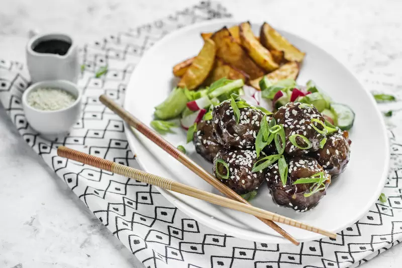 Подавайте глазированные мясные шарики с запеченным картофелем и свежим салатом, посыпав перед подачей кунжутом. Блюдо поразит восхитительным сочетанием вкусов и цветовой палитрой! Приятного аппетита!