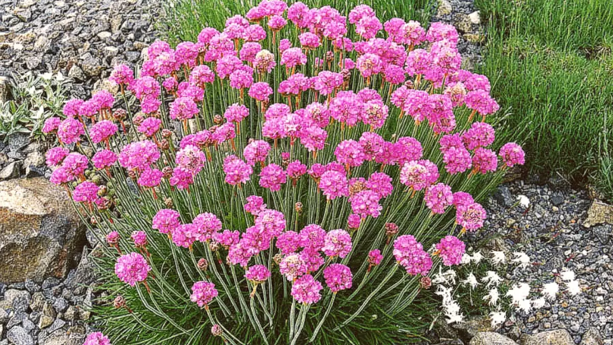 - Армерия приморская (Armeria maritima) — самая известная из армерий, с бутонами розового, белого и карминного цвета. Она формирует компактные подушки высотой до 15 см, идеально подходящие для каменистых садов.