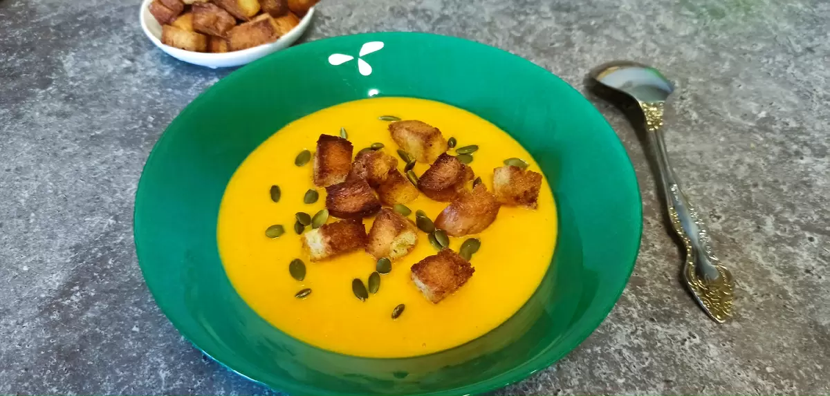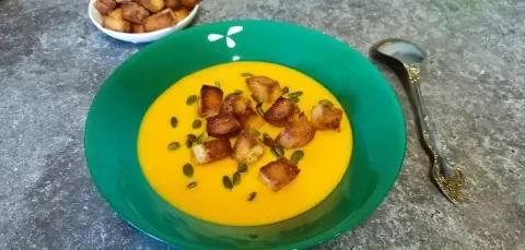 Разлейте готовый крем-суп по тарелкам, украсив его хрустящими сухариками и тыквенными семечками. В итоге получается тепло и уют осеннего вечера в тарелке: легкий, сладковатый и согревающий суп, который никого не оставит равнодушным.
