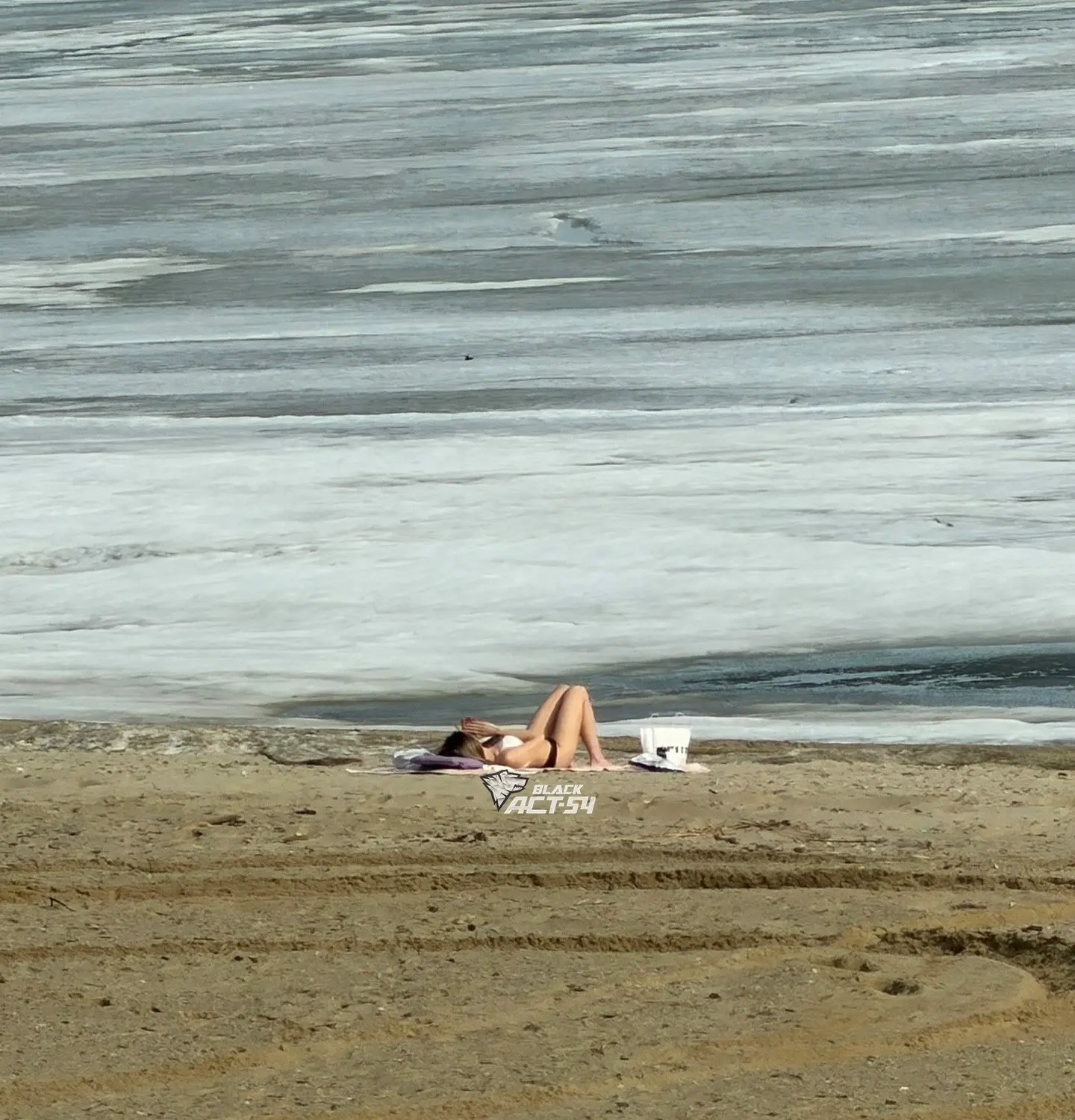 Загорающую девушку заметили на «Бумеранге» в Новосибирске. В городе, конечно, потеплело. Но водоем-то ещё во льду