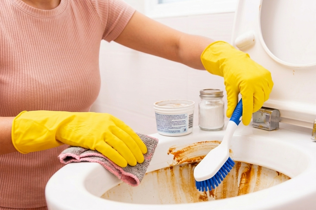 При сильных загрязнениях важно использовать правильный подход: уберите воду из чаши, нанесите средство, оставьте на длительное время и затем аккуратно протрите мягкой щёткой.