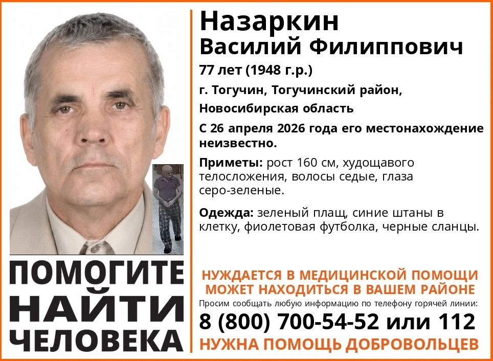 26 апреля в городе Тогучин Новосибирской области 77-летний Василий Назаркин ушел в неизвестном направлении и пропал. Его уже ищет поисково-спасательный отряд «ЛизаАлерт.
