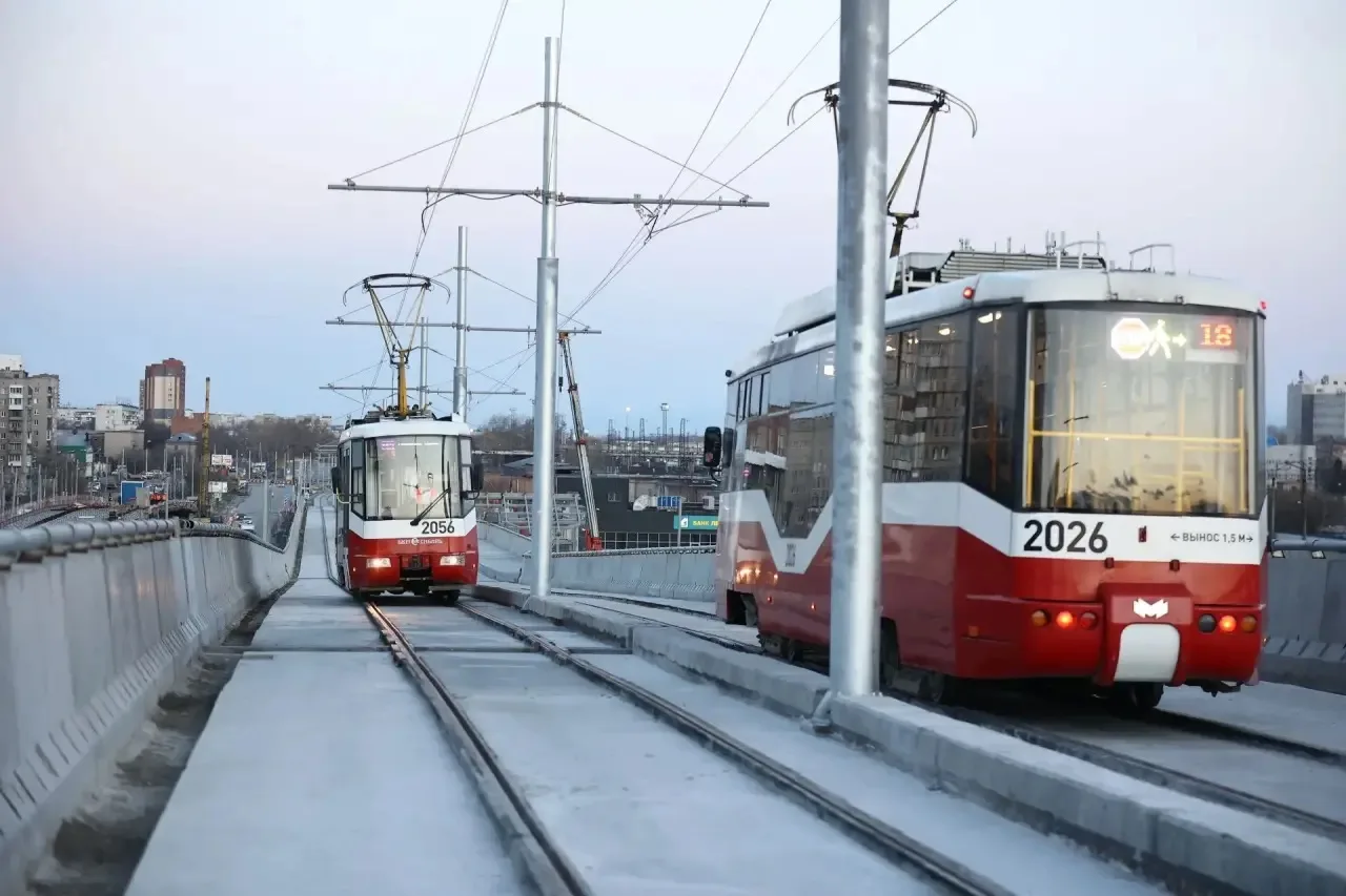 В рамках строительства 4-го моста в Ленинском районе введена в эксплуатацию новая трамвайная эстакада через площадь Труда. Путепровод с двухпутной линией соединяет улицу Широкую с улицей Ватутина, обеспечивая движение по обособленному пути. Таким образом, устранили пересечения с автомобильными потоками и троллейбусной контактной сетью. Это решение позволит значительно снизить риски ДТП, исключить заторы и повысить общую безопасность движения.